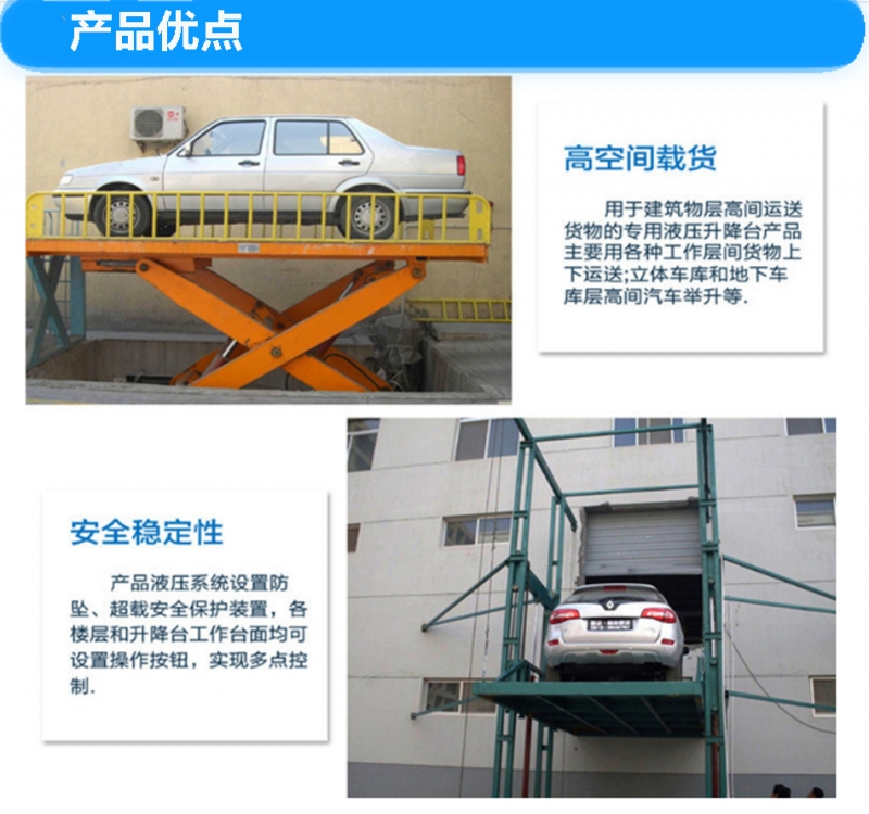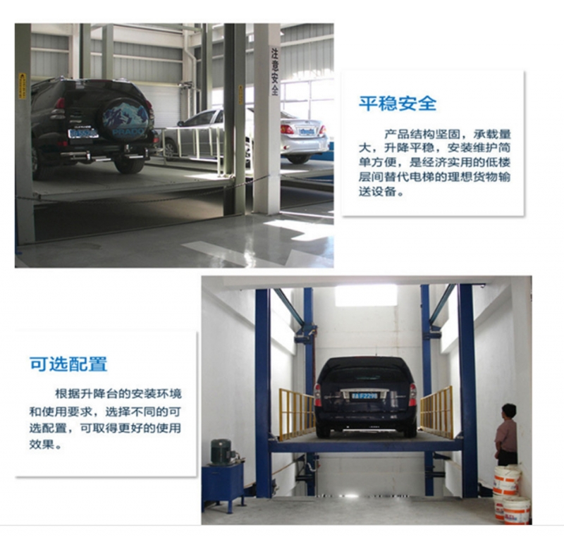 详细信息 产品用途 用于各种工作楼层间汽车上下输送 适用场所 广泛适用于4S店、大型修理厂、多层地下停车场等 基本参数 载重 3.0-5.0(t) 台面长 5000-6000(mm) 台面宽 2500-4000(mm) 举升高度 3000-15000(mm) 电源 380(v) 根据各户要求定制,客户需提供如下信息: 1. 升降高度及载重量 2. 升降平台的台面尺寸 3. 升降范围(井道尺寸)